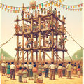 During the festival, villagers build a sturdy scaffold (Scaffold) by lashing together two strong tree trunks (Tree, Two) and anchoring a colorful parade float (ParadeFloat) at the top. The structure lets children climb up and watch the parade safely.
