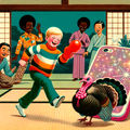 The turkey squeals, but you’re faster-you scoop it up with the foam finger, hoist it proudly from the ground, and stuff it into a glittering handbag shaped like a smartphone.