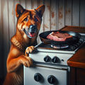 Asked to define Sort of thing, the chef lays a slice of body part, meat on the stove top while an attentive Dog tilts its head in understanding.