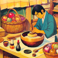 Glossy After a Bountiful harvest, the lacquerer mixes rich Color and polishes until the bowl shines like a mirror.